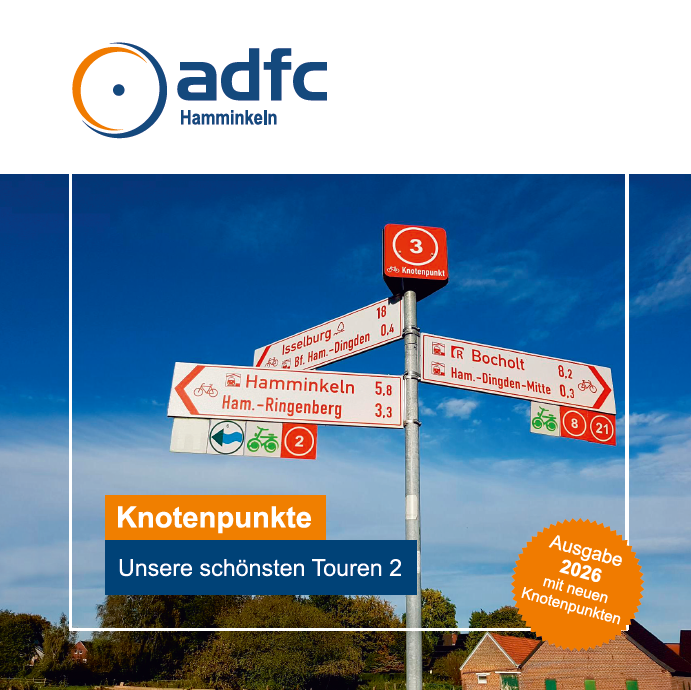 Auch wenn die Digitalisierung weiter voranschreitet, so ist doch die Nachfragte nach Printprodukten weiterhin ungebremst. Der ADFC Hamminkeln hat sich daher entschlossen eine Übersichtskarte des Knotenpunktsystems inklusive Radtourenvorschlägen herauszubringen. Das Fahrrad-Knotenpunktsystem im Kreisgebiet Wesel wurde erweitert, um eine bessere Orientierung und Nutzung für Radfahrer zu ermöglichen. Im Rahmen dieses Projekts erstellte der ADFC Hamminkeln eine umfassende Broschüre, die sowohl das bestehende als auch das neue Knotenpunktsystem sowie das gesamte Radnetz der Region – auch über die Kreisgrenzen hinaus – vorstellt.
