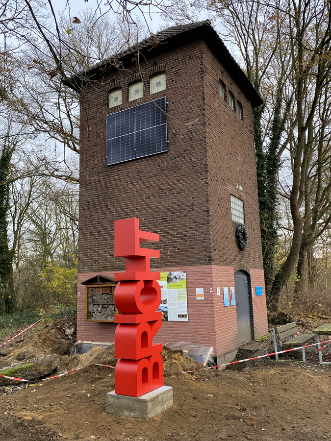 Auf der Außenfläche der Turmstation "Alter Postweg" in Schermbeck Bricht wurde eine 3 m hohe Schriftzugstele mit dem Ortsteilnamen "BRICHT" aufgestellt. Die Turmstation befindet sich am Ortseingang des Schermbecker Ortsteiles Bricht und in unmittelbarer Nähe zur Römer-Lippe-Route.